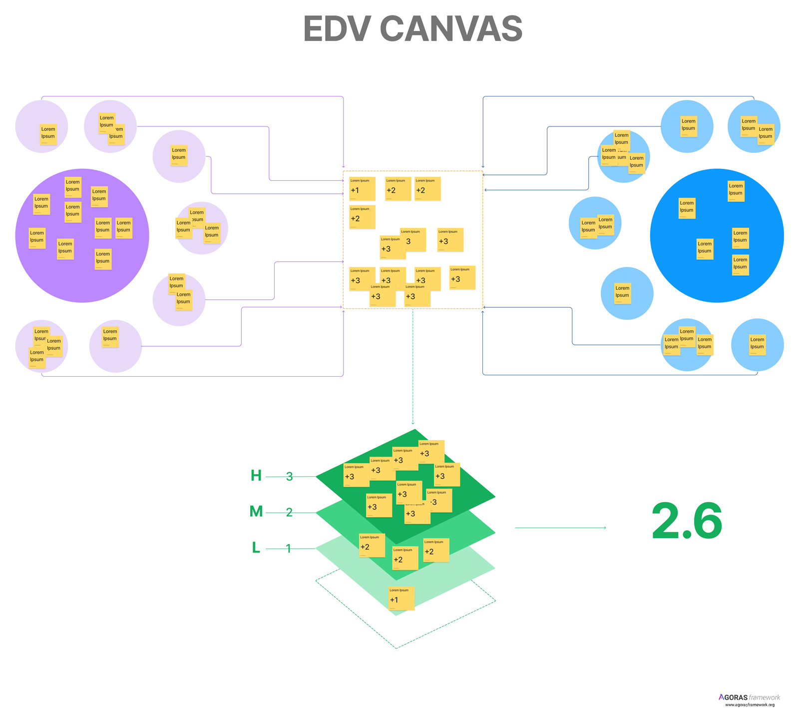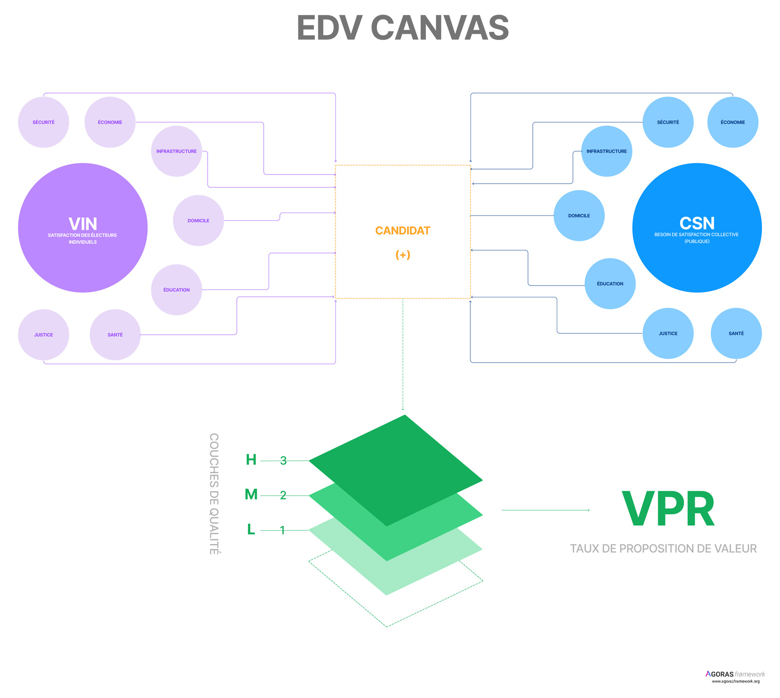Le Electoral Delivery Value Canvas est une méthode qui est utilisée plus tard au début de la première phase de la Feuille de Route (Formation). Son but est de se concentrer sur la compatibilité entre les propositions du candidat pour les besoins individuels (ce que les électeurs demandent) et les besoins publics du groupe (ce dont l'État a besoin). A travers l'EDV Canvas, le candidat se positionne comme un point intermédiaire avec des propositions qui ajoutent de la valeur d'autant plus qu'elles sont compatibles entre elles. En fin de compte, plus le PVR moyen (Proposal Value Rate) est élevé, plus la qualité des propositions de campagne est élevée, apportant des solutions aux besoins des électeurs et une valeur différenciée pour l'État.
