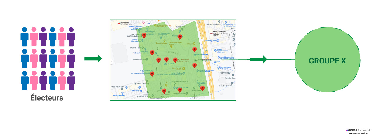 Schéma sur une carte différentes zones géographiques contenant des groupes d'électeurs. Exemple : Zone Nord.